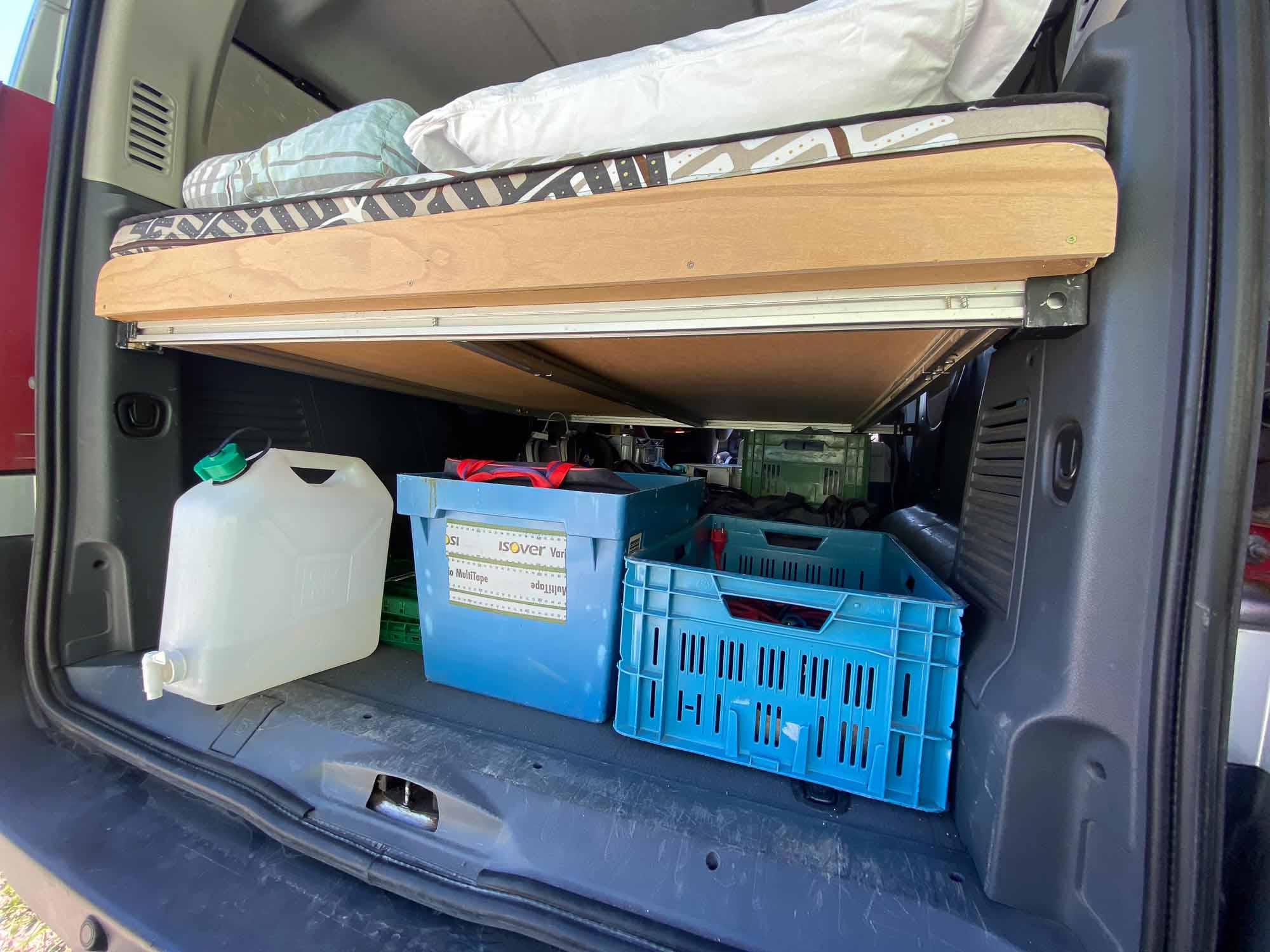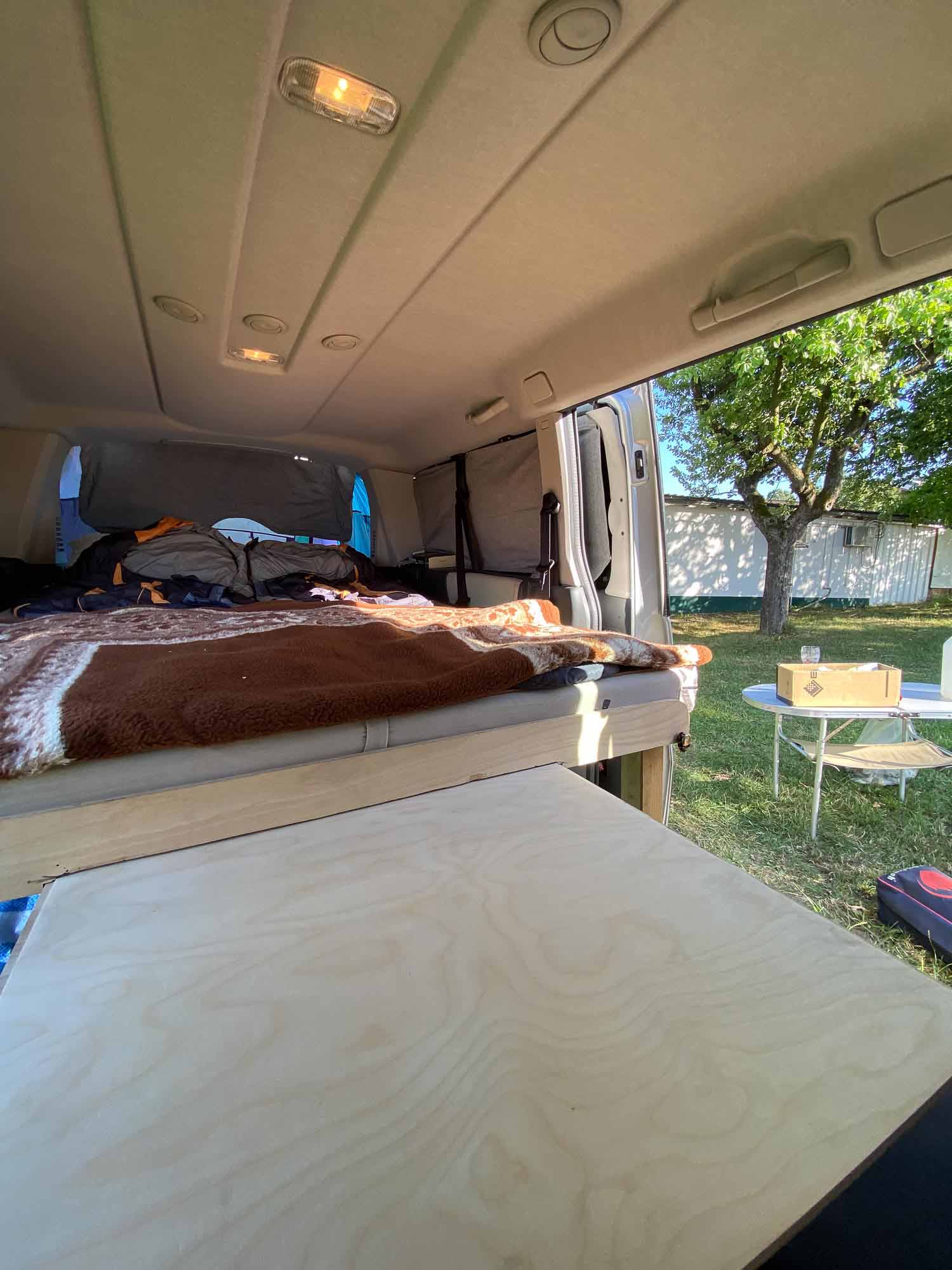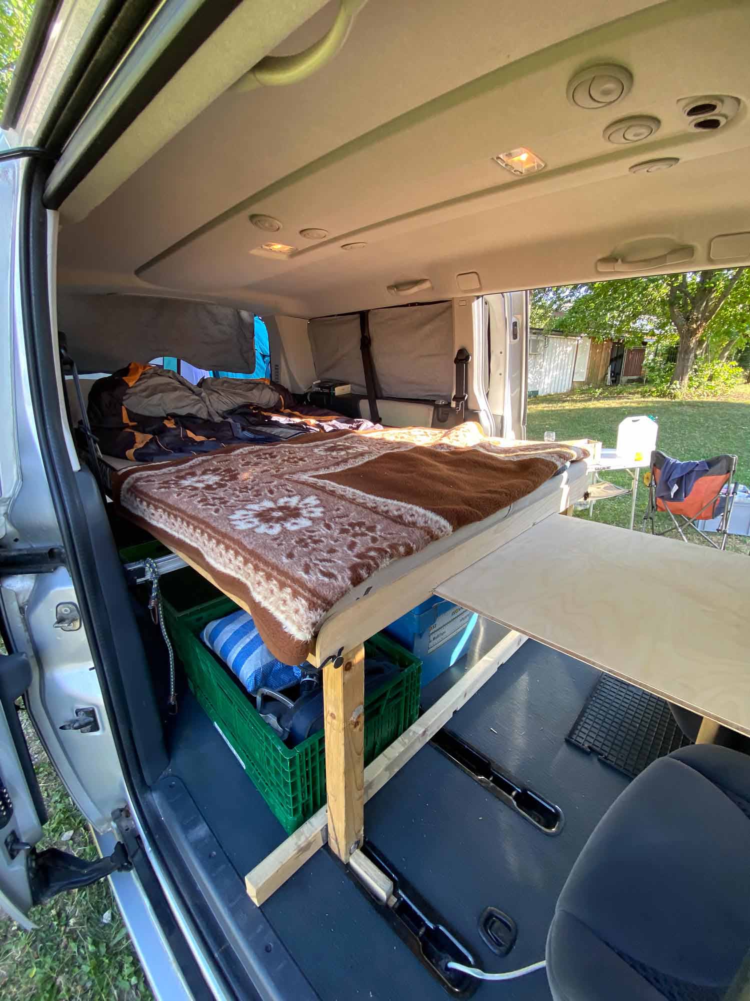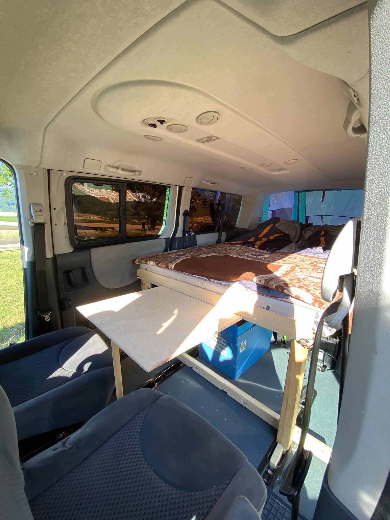 Mit wenigen Handgriffen lässt sich das Bett herausnehmen und der Innenraum flexibel nutzen – entweder als 2-Sitzer mit großer Ladefläche oder als 4- bis 8-Sitzer. Aktuell sind 5 Sitze vorhanden.