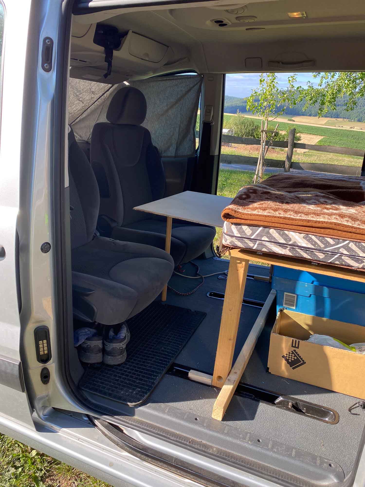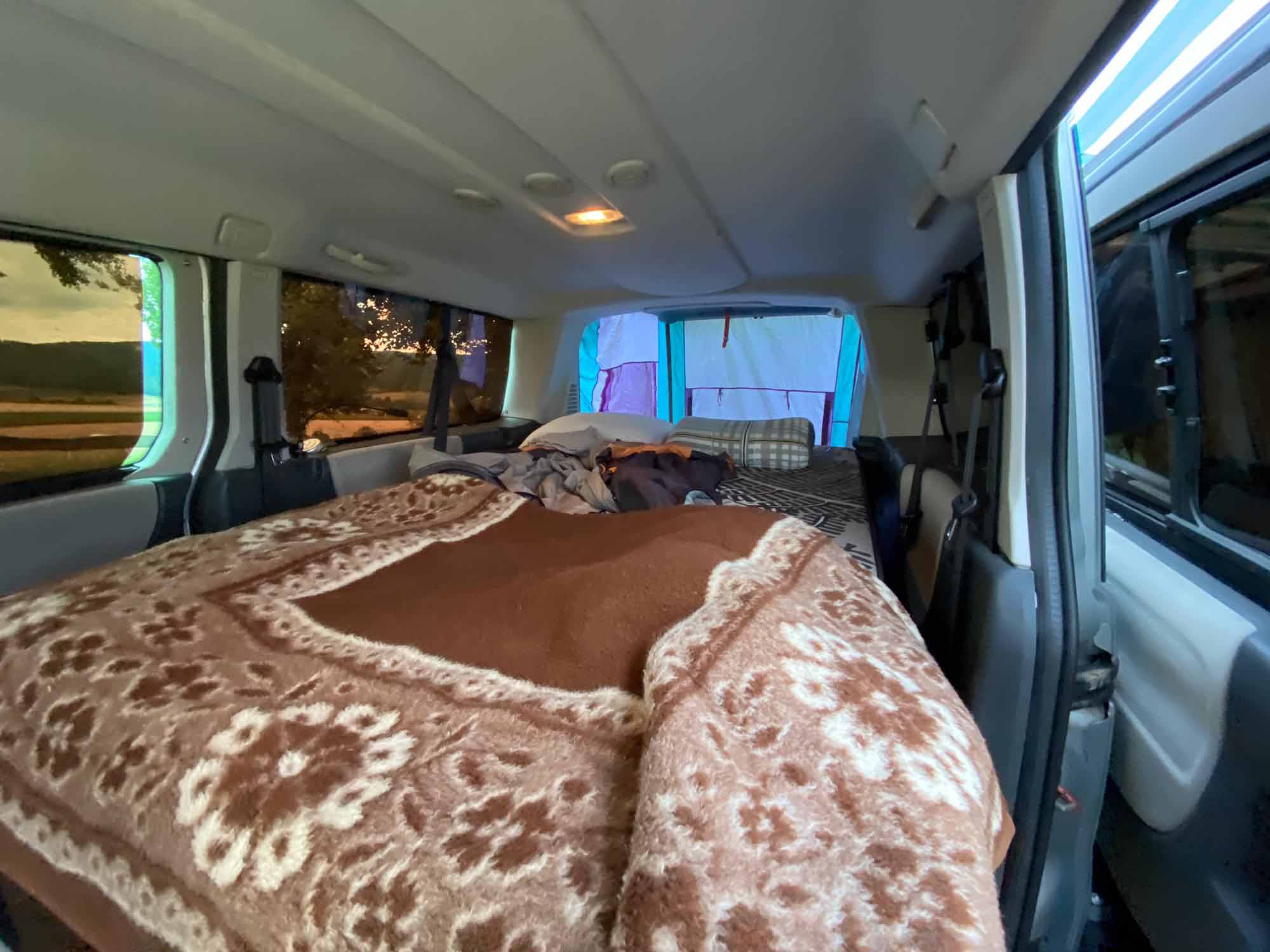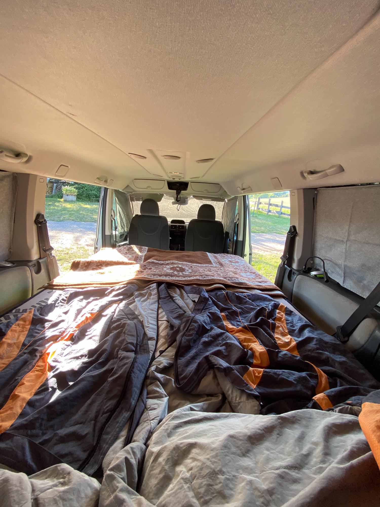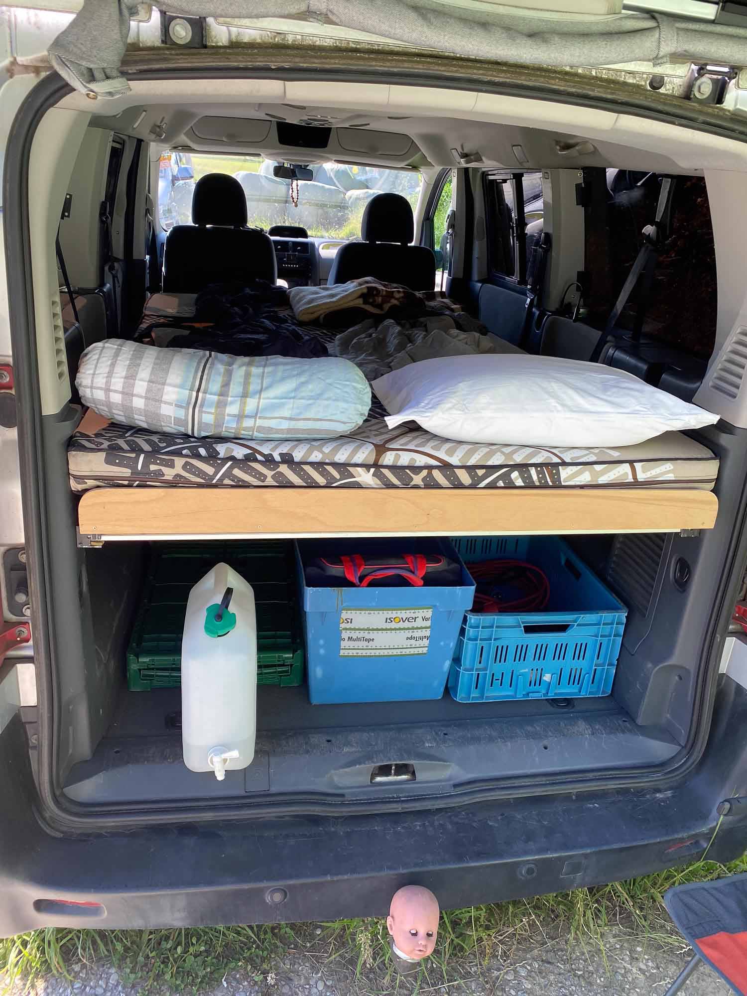 Mit wenigen Handgriffen lässt sich das Bett herausnehmen und der Innenraum flexibel nutzen – entweder als 2-Sitzer mit großer Ladefläche oder als 4- bis 8-Sitzer. Aktuell sind 5 Sitze vorhanden.