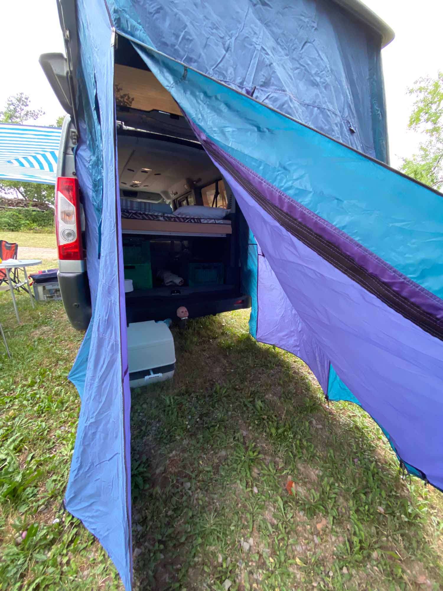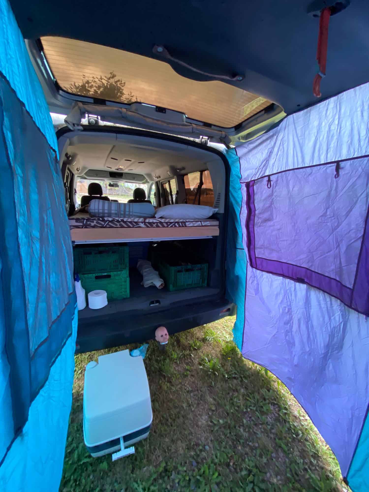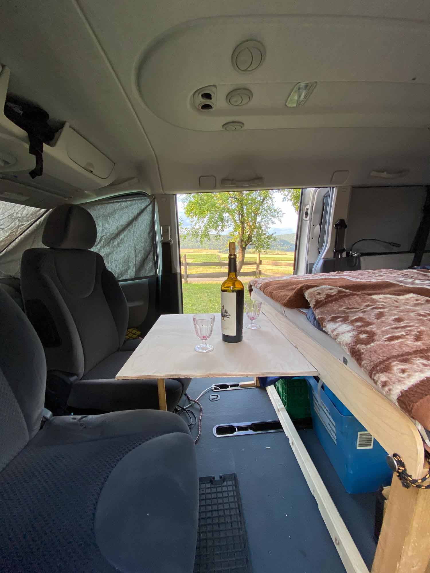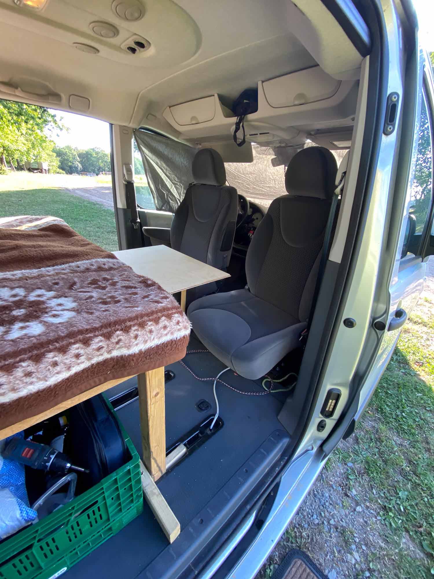 Mit wenigen Handgriffen lässt sich das Bett herausnehmen und der Innenraum flexibel nutzen – entweder als 2-Sitzer mit großer Ladefläche oder als 4- bis 8-Sitzer. Aktuell sind 5 Sitze vorhanden.
