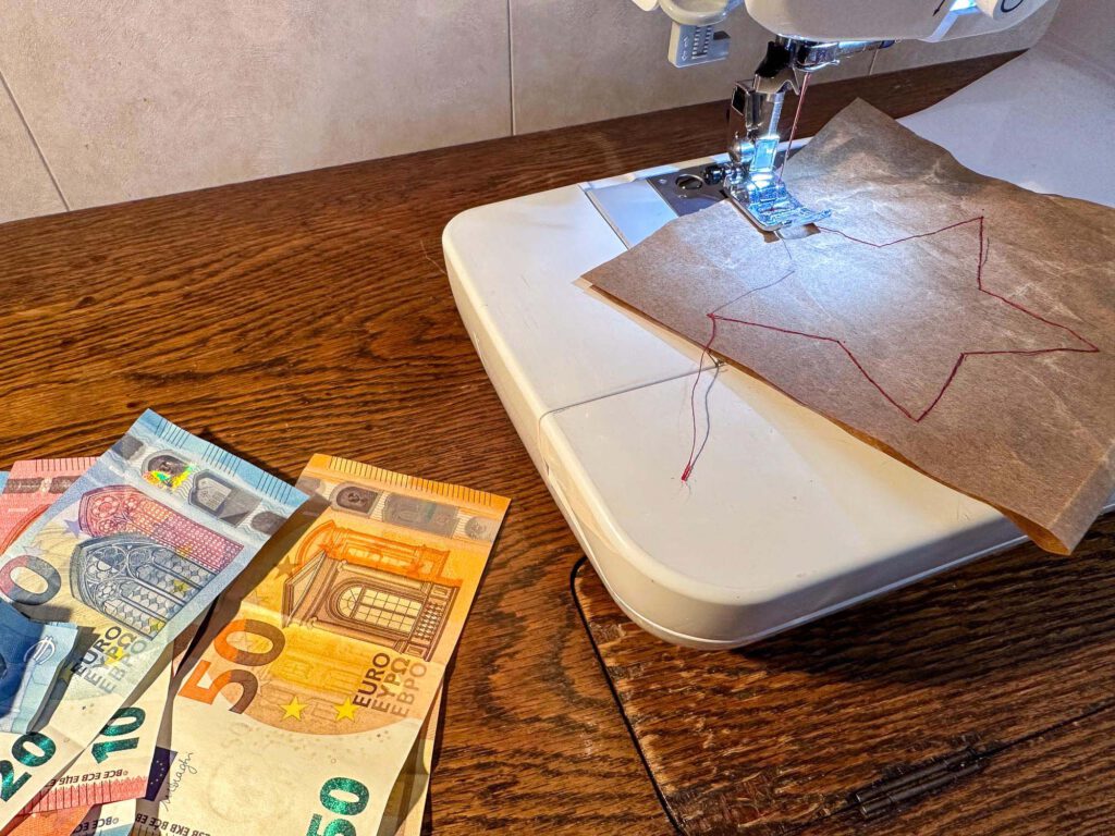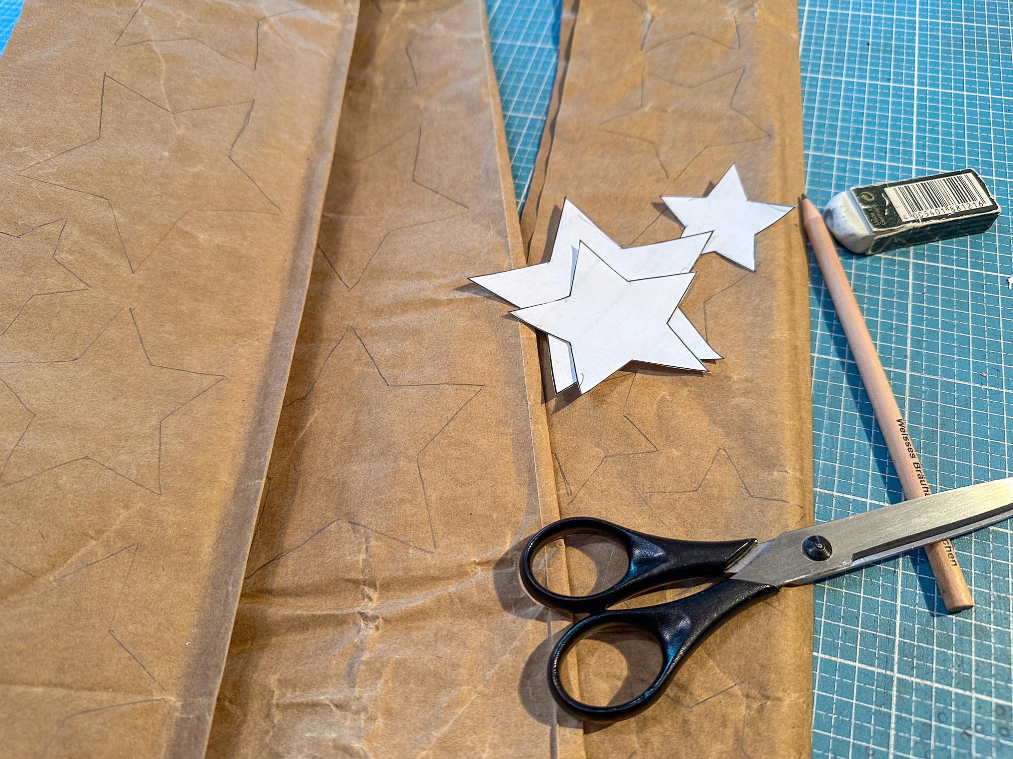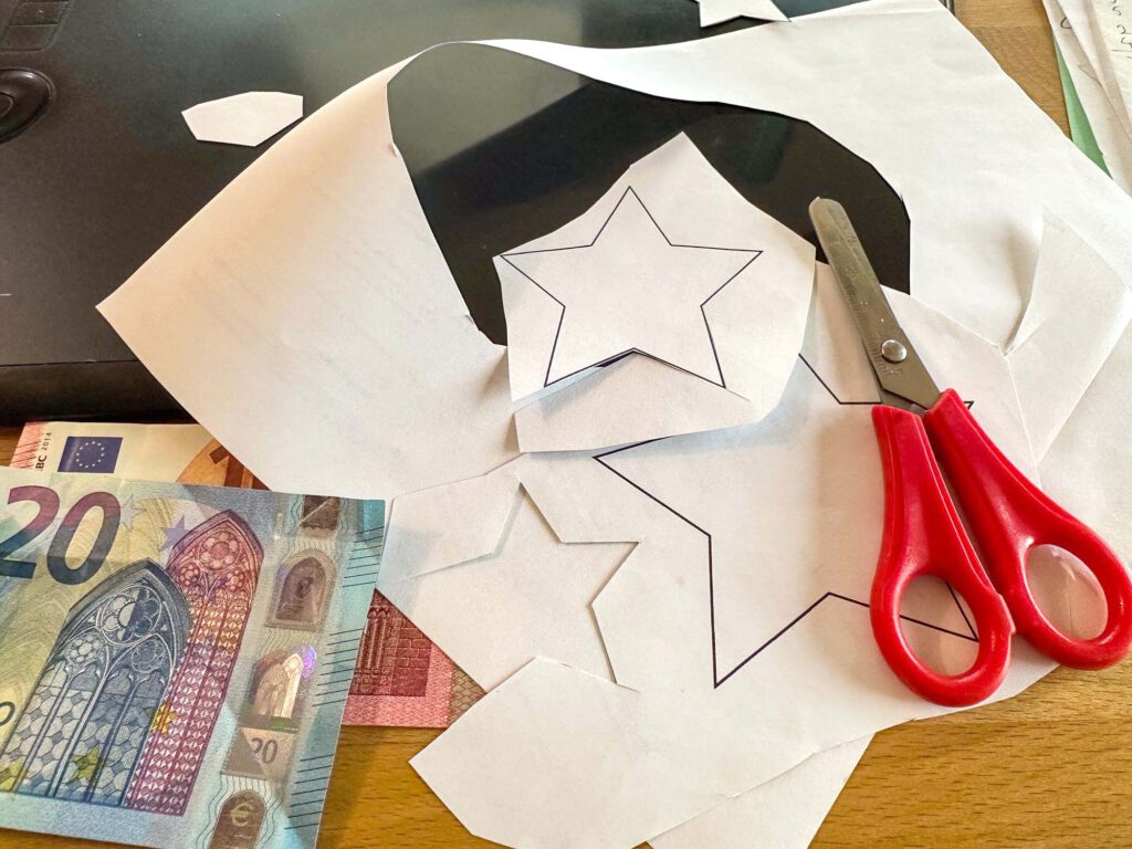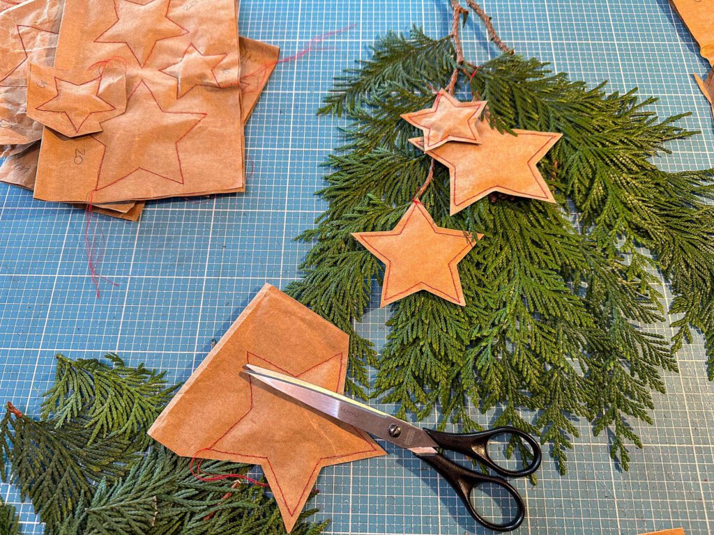 Ich habe das Papier in drei verschiedenen Sternformen ausgeschnitten – das macht die Verpackung gleich dynamischer. Bevor ich die Sterne ganz zusammengenäht habe, habe ich das Geldgeschenk darin versteckt. Danach wurden die Sterne komplett zugenäht.