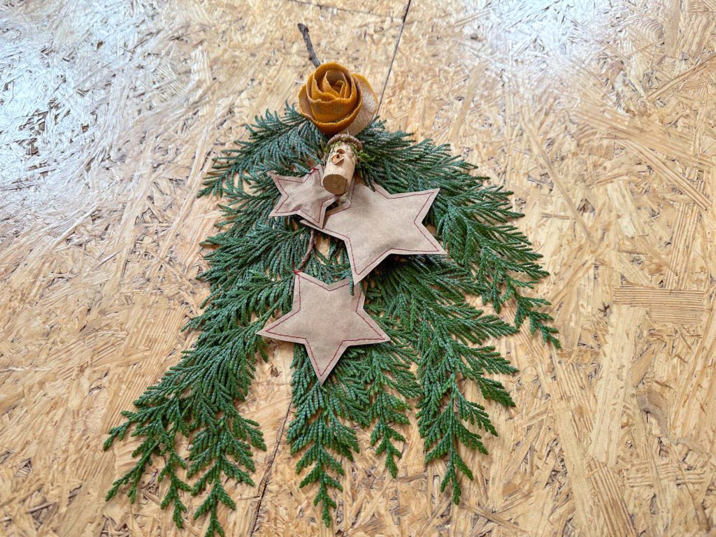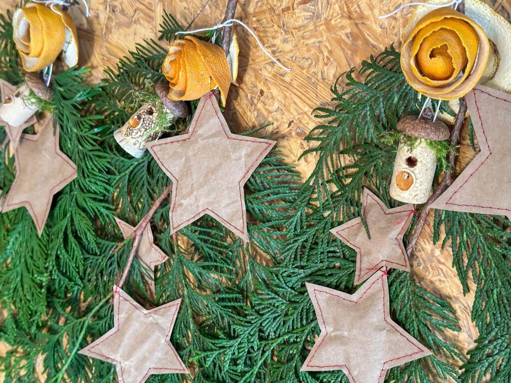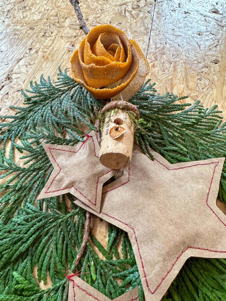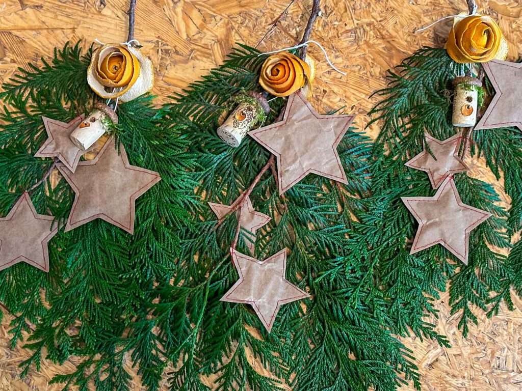 Damit die Sternen einen festlichen Touch bekommen, habe ich sie mit ein paar Thuja-Zweigen zusammen gebunden. Für den besonderen Look habe ich zudem Rosen aus getrockneten Orangenschalen und selbstgemachte Vogelhäuschen aus Weinkorken (Bestellung auf nachfrage) hinzugefügt.